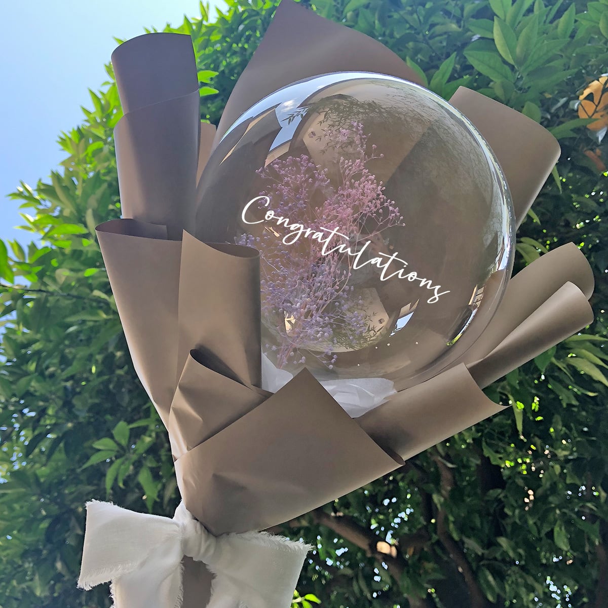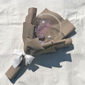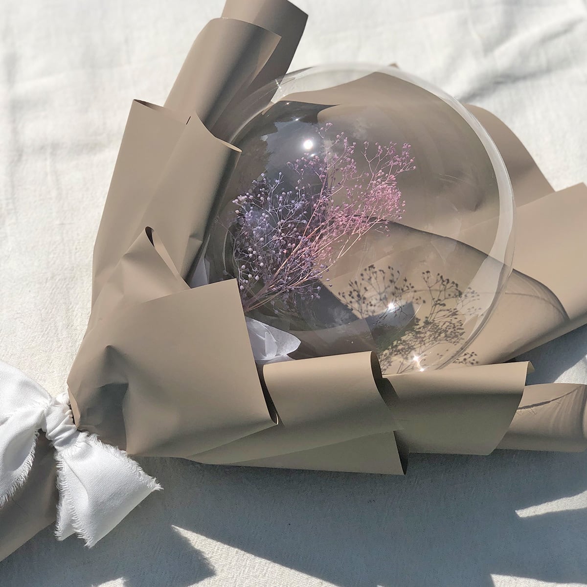 透き通ったバルーンの中に、ドライフラワーが入ったブーケ