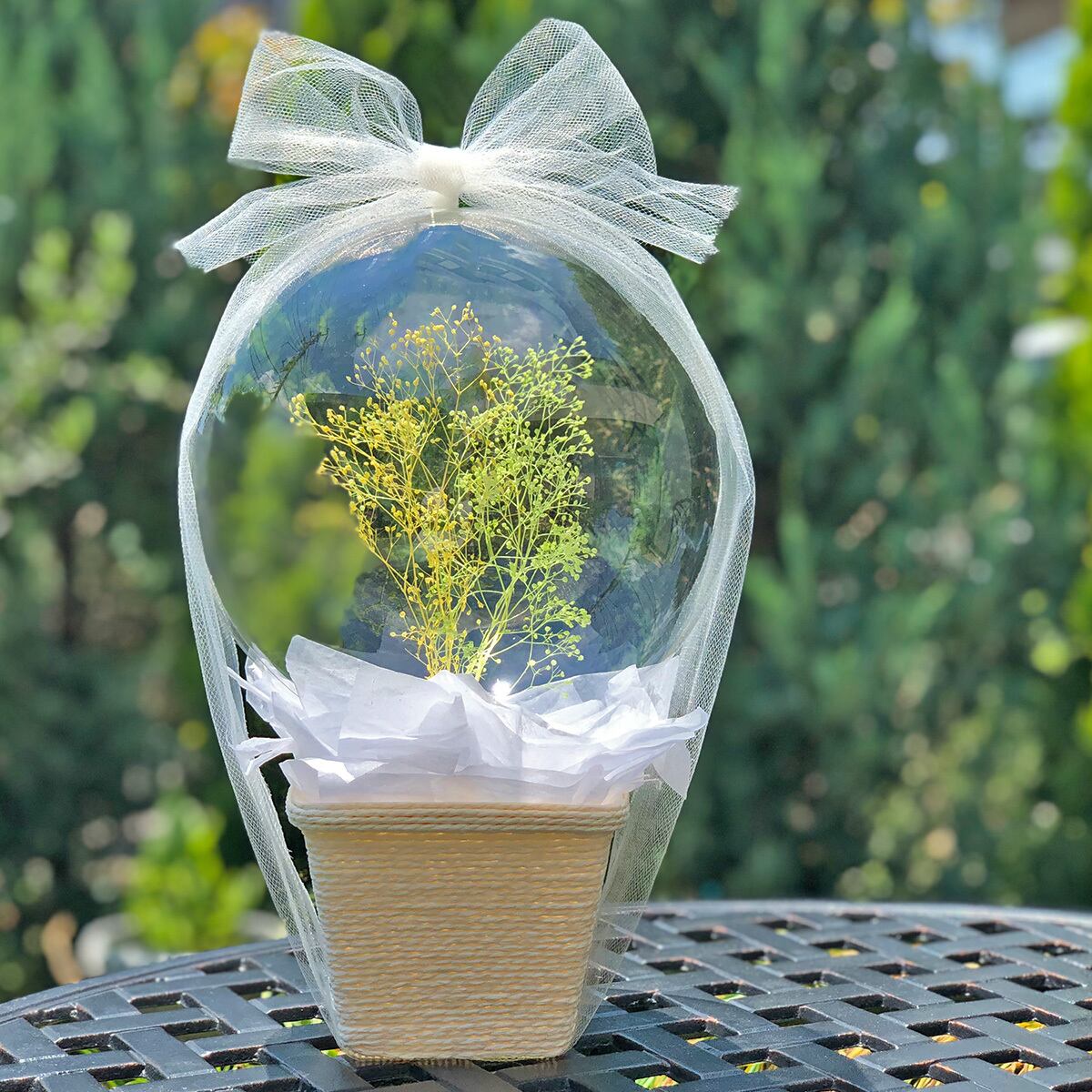 透き通ったバルーンの中に、ドライフラワーが入った卓上アレンジメント