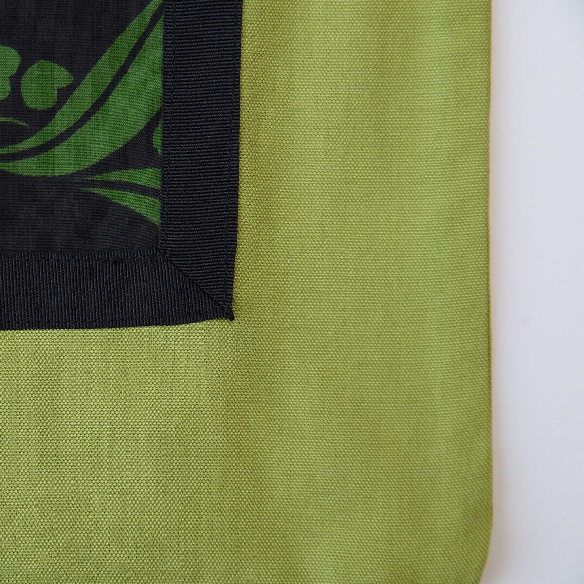 ハワイの植物柄プリント生地を、黄緑色の国産オックス生地の上に、額装に見立てて黒のグログランテープにて縁取りました。