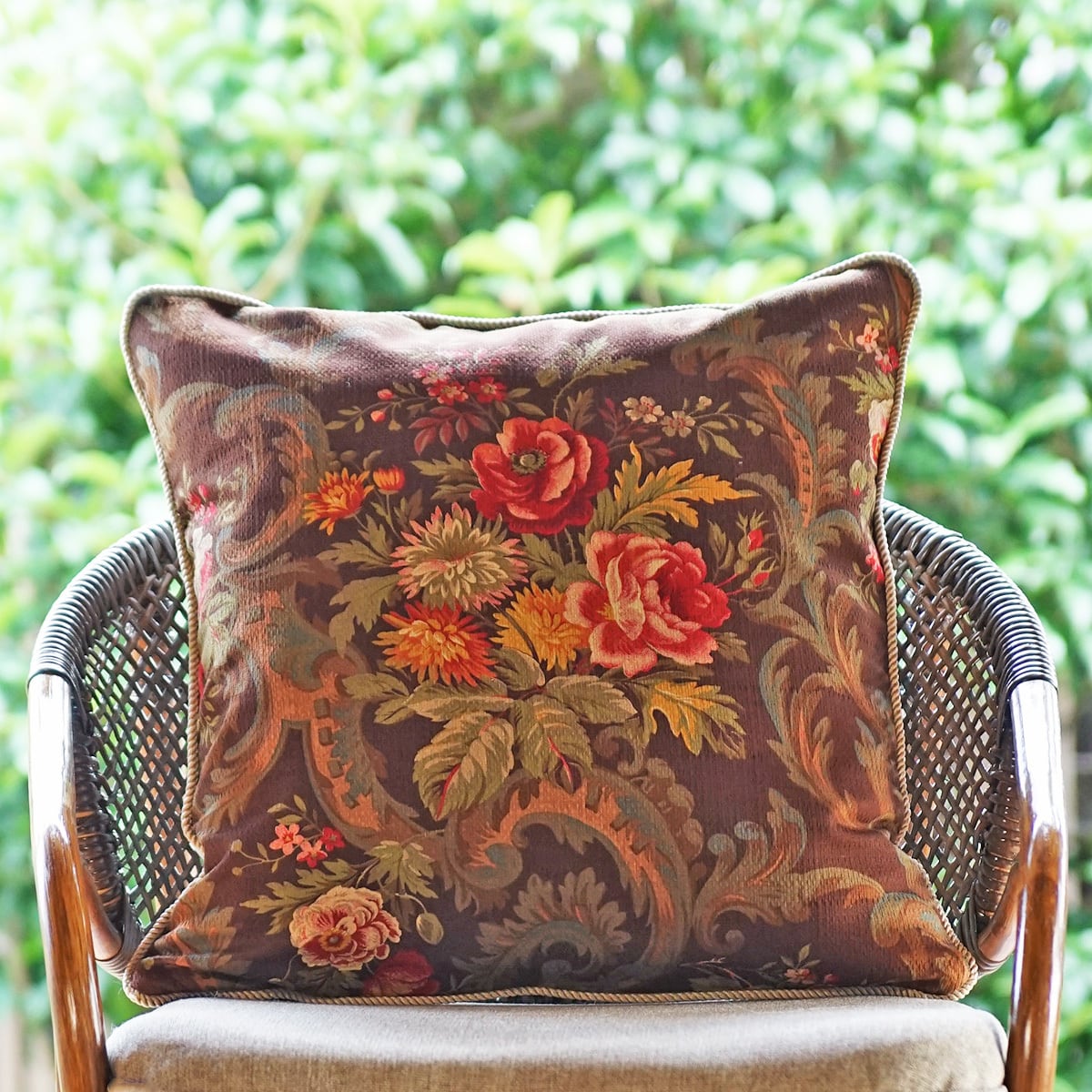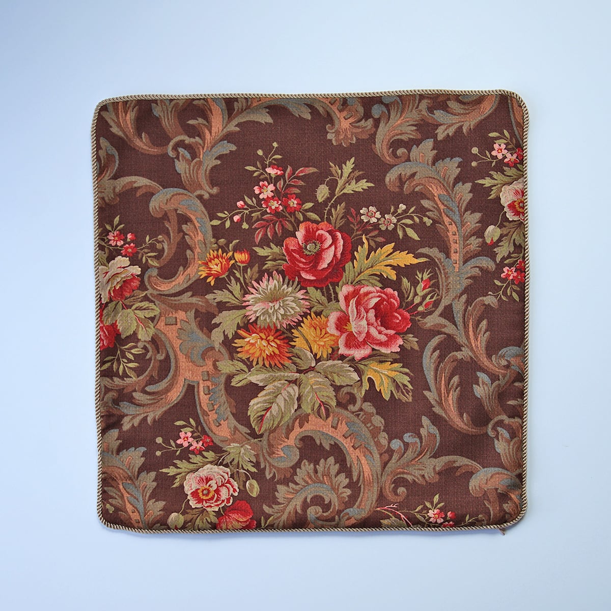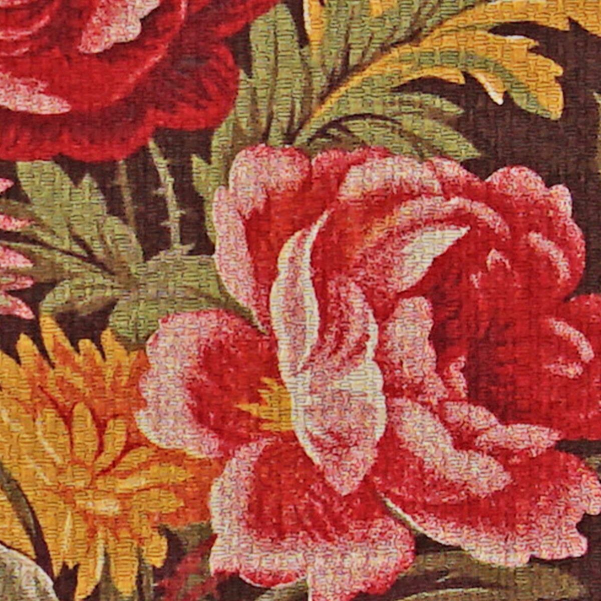 チョコブラウン地にクラシックなフローラルブーケ柄、ドビー織の表情が美しいアンティーク感のある生地です。