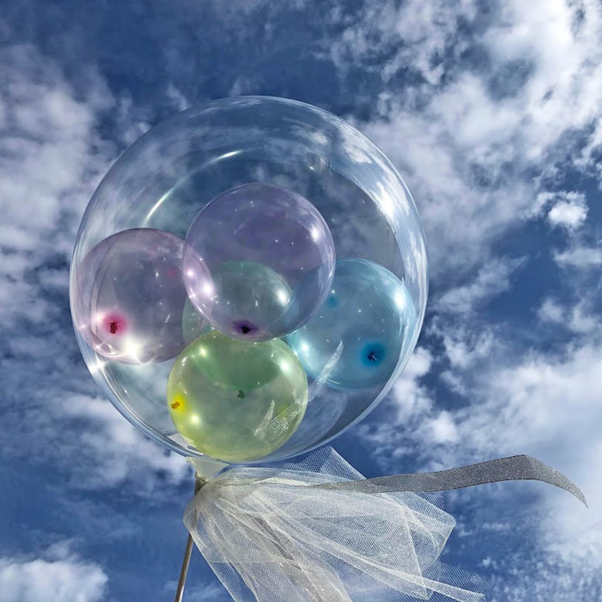 透き通った風船の中に、色付きゴム風船が入ったスタンド型バルーンのアレンジメント