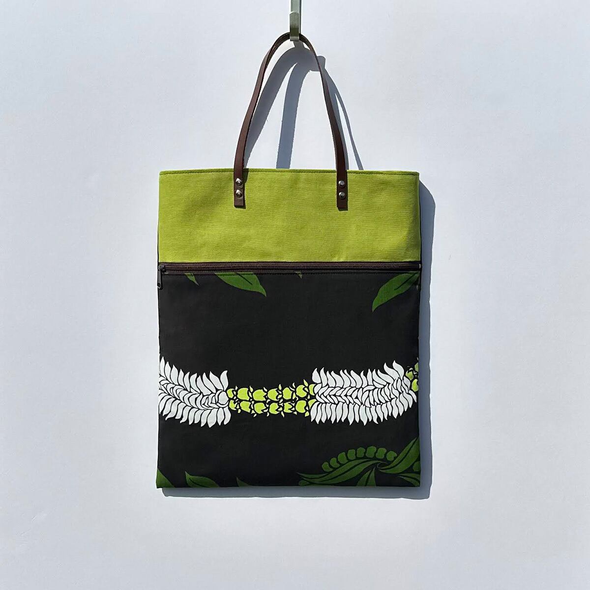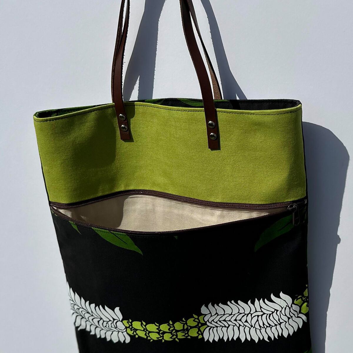 ハワイ輸入生地 A4サイズ ファスナーポケット付き トートバッグ バイカラー 黒地レフア&レイ×イエローグリーン マチ無し シンプルサブバッグ