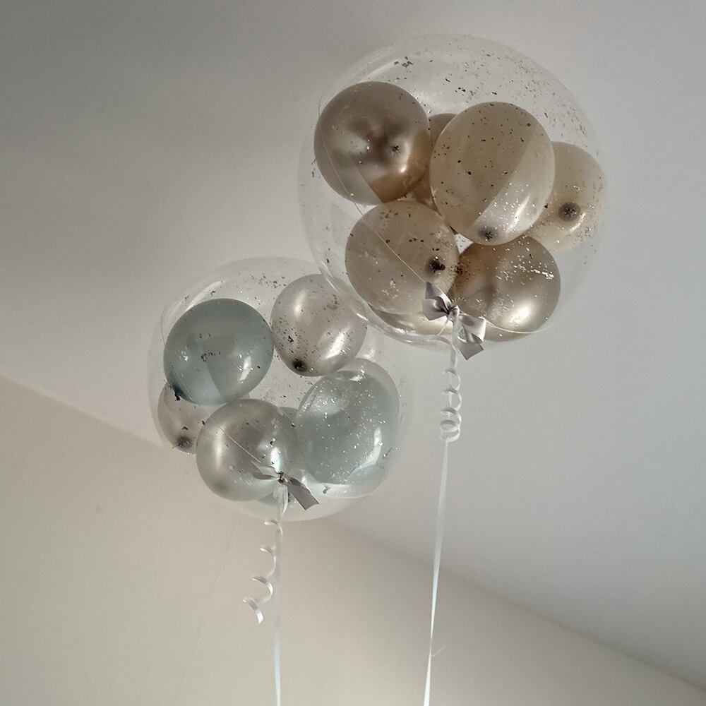 クリアバルーンの中に、ラメフレークと、色付きゴム風船が入ったアレンジ