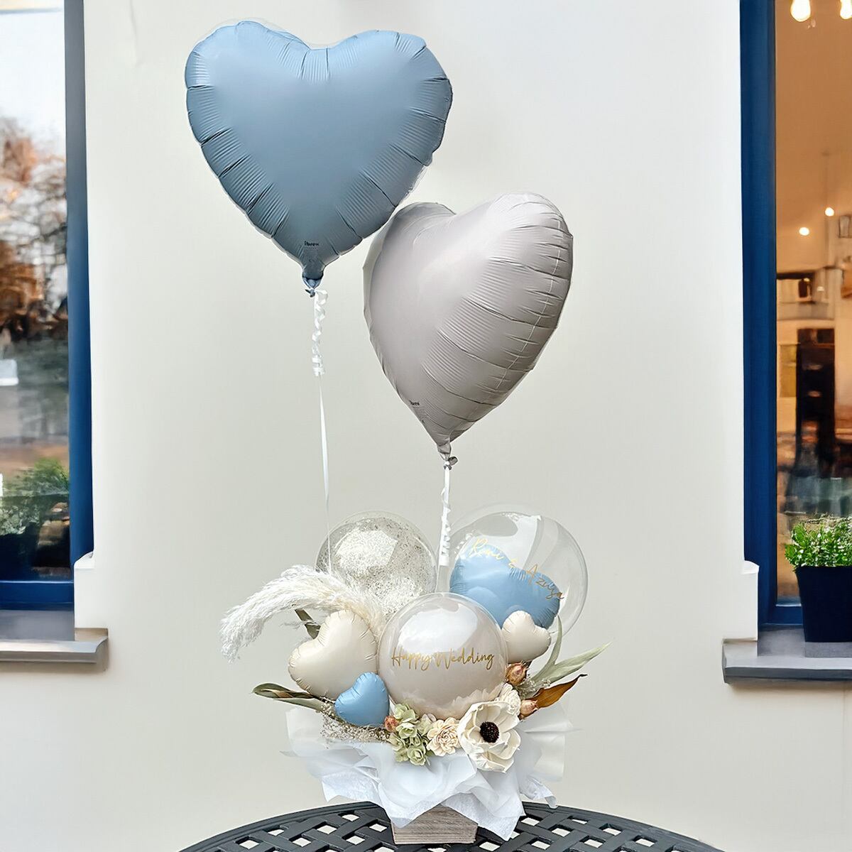 ホイルフレーク(シャンパンゴールドカラー)入りバルーン・可愛いハートが入ったバルーン等と、ドライフラワー・ソラフラワーでナチュラルな雰囲気にまとめた卓上アレンジメント