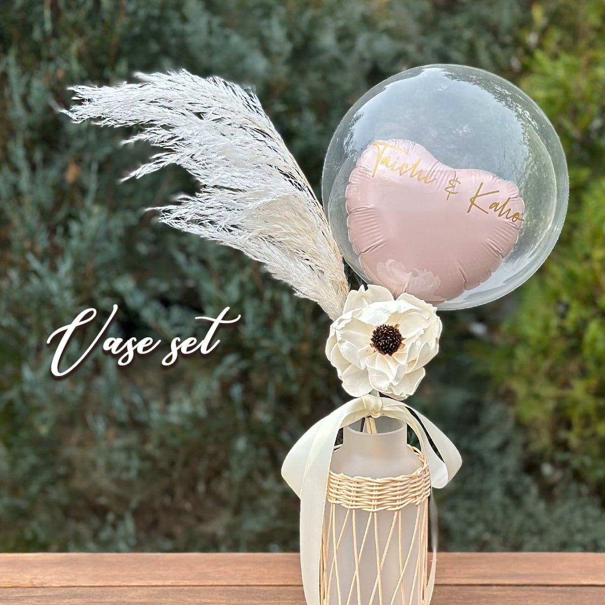ラタンとフロスト調の白いガラスの組み合わせで、清楚な雰囲気を持ったおしゃれな花瓶がセットになった、ドライフラワー&バルーンのアレンジメント